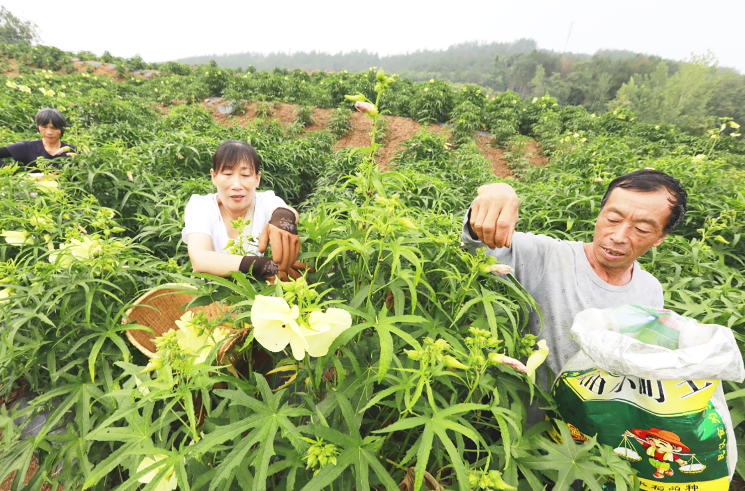 湖北省竹山县宝丰镇深沟村村民们采摘黄蜀葵