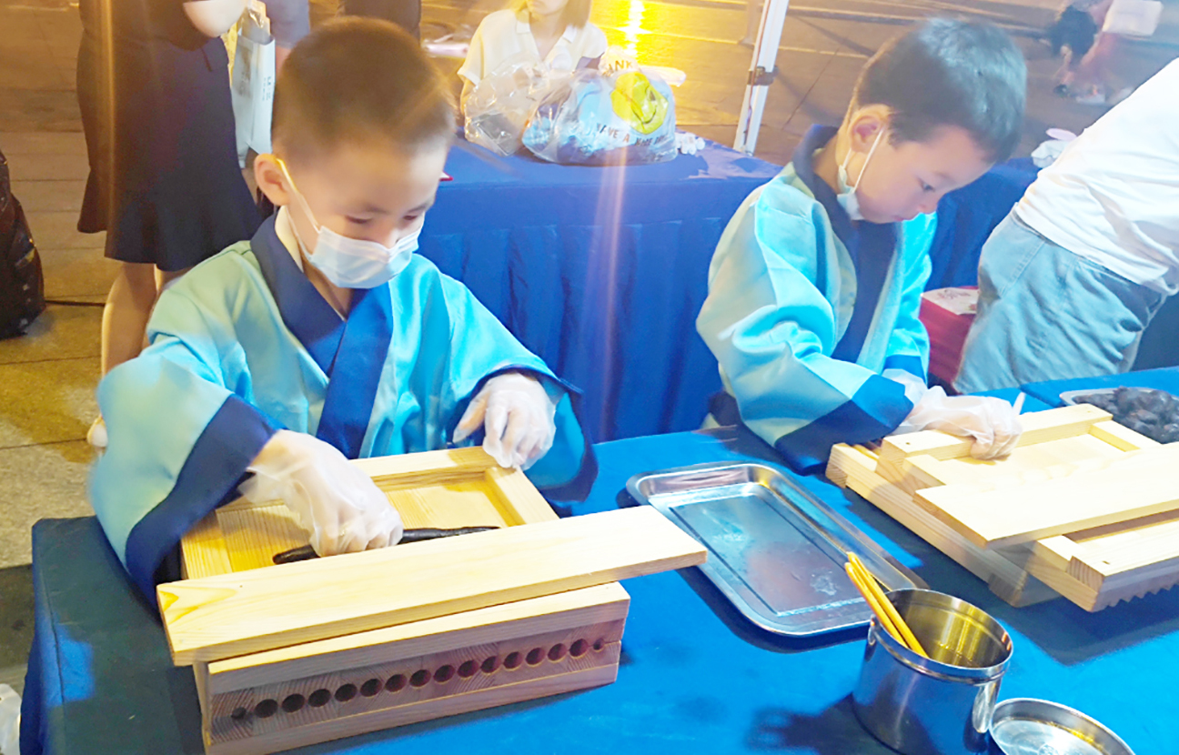 图为在中药产品制作区,小朋友制作中药丸剂。