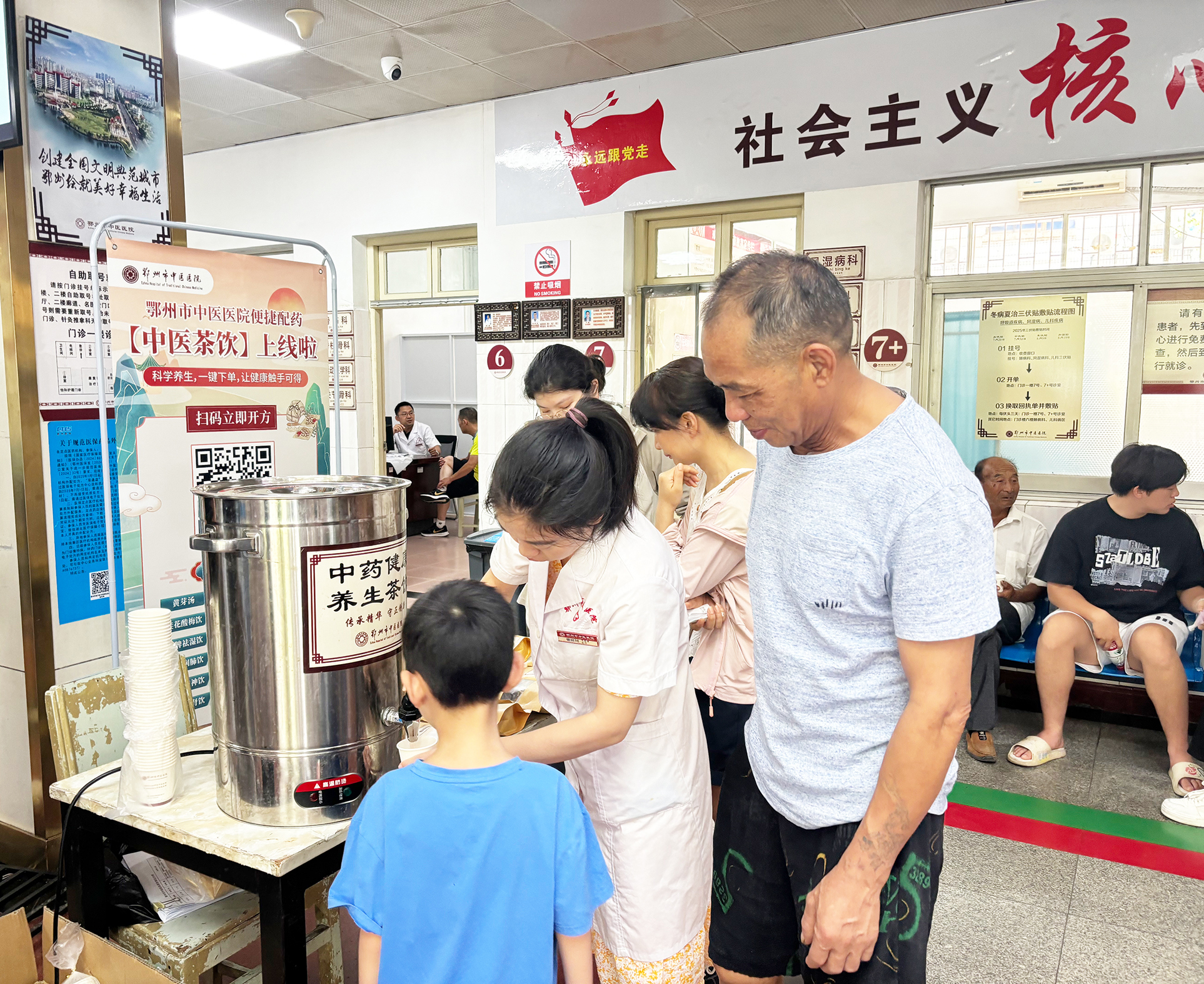近日,湖北省鄂州市中医医院滨湖院区门诊大厅香气四溢、人头攒动——该院便捷配药服务上线首日,举办了一场“中医药养生茶饮现场试饮会”,六款茶饮吸引众多市民驻足咨询、品尝。