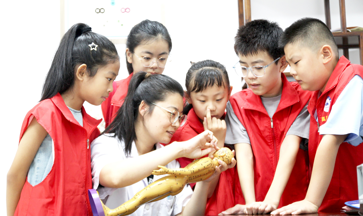 图为孩子们在医务人员指导下辨识穴位。张磊摄