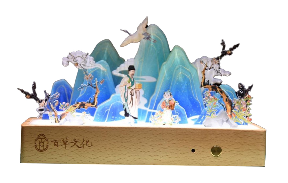 当指尖轻触底端按钮,暖光悄然亮起,一幕斑驳光影便在墙面上缓缓铺陈:层叠远山如黛,一位白发老者正俯身与稚童细语,仿佛穿越数百年时光,将李时珍“踏遍万水千山、亲尝百草”的执着瞬间凝固于现代居室之中。这盏由百草文化传播有限公司倾力打造的“时珍寻药”本草创意灯具,在全国文创产品设计大赛中脱颖而出,荣膺“最佳商业转化奖”。