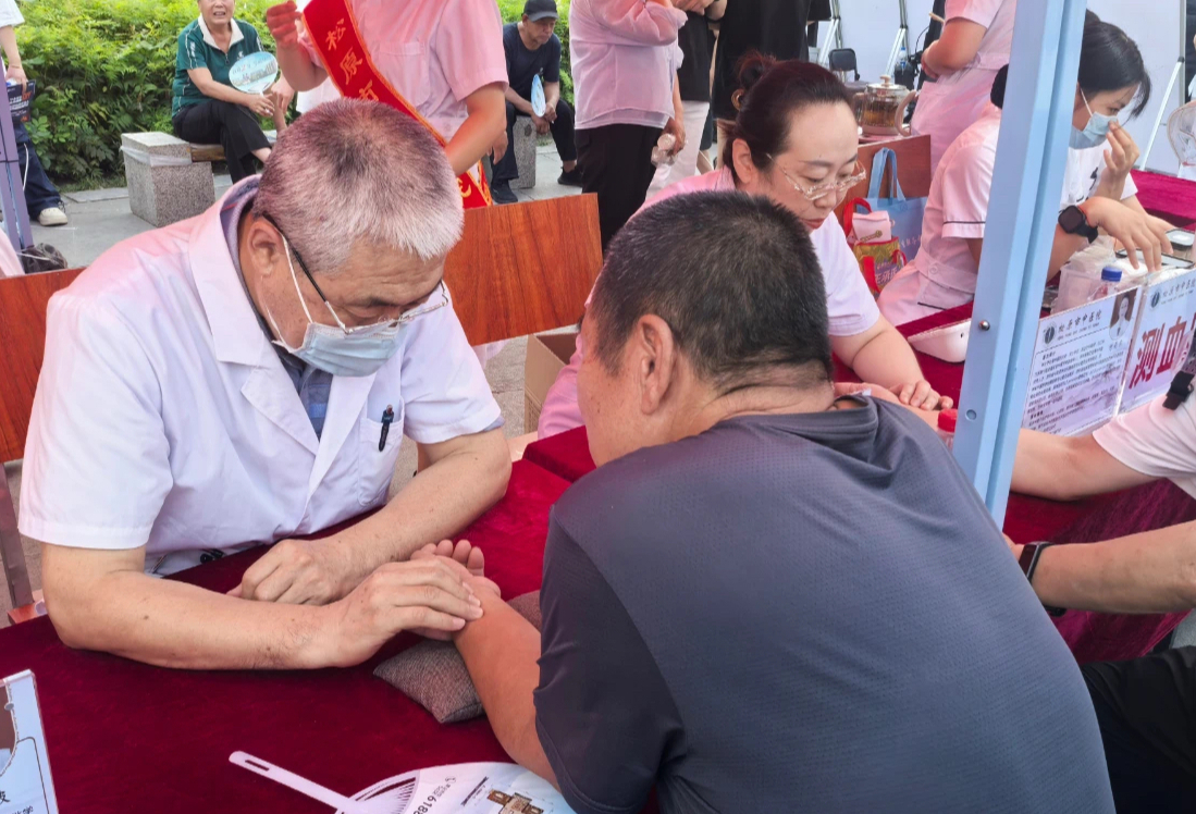 松原市中医院“中医文化夜市”现场,中医专家为市民进行把脉。