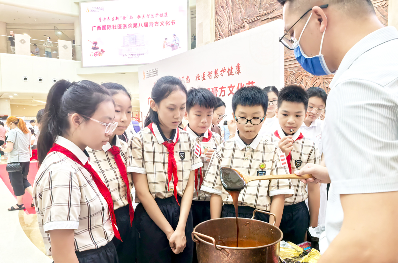 9月8日,广西国际壮医医院第八届膏方文化节暨自治区级中医康复中心建设单位揭牌仪式举行。活动设置名医义诊、膏方品鉴、药膳品尝、中(壮瑶)医药文化展示等环节,“五和养生膏”“谷道健脾膏”“温阳养胃膏”等特色膏方受到群众欢迎,现场参观的小学生也对膏方制作及膏方文化颇感兴趣。