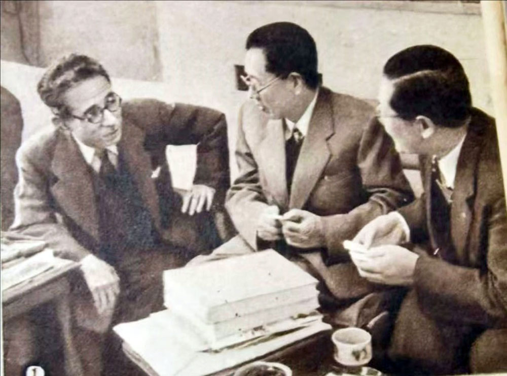 岳美中(中)与日本著名汉方医学家大冢敬节(左)交流学术。