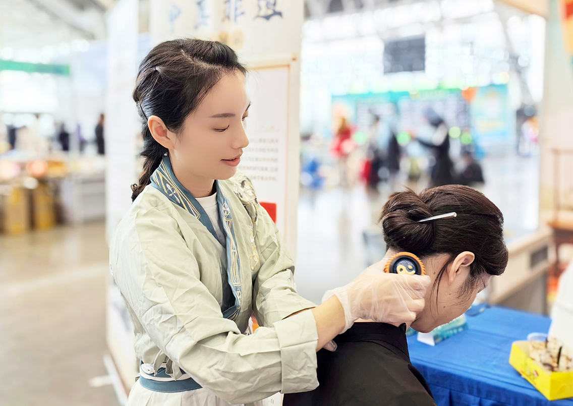 图为该参展人员在现场体验中医特色护理技术。