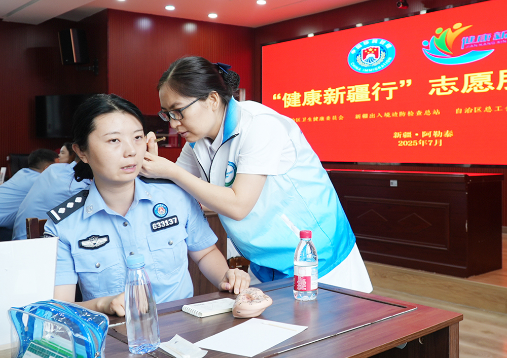 医务人员为阿勒泰出入境边防检查部门工作人员耳穴压丸。