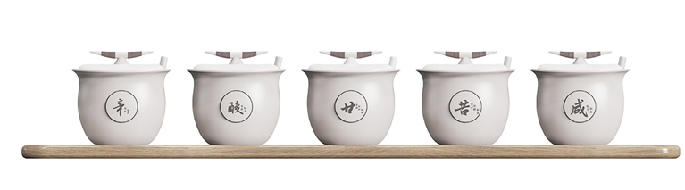 这套概念产品由五个陶瓷调料罐组成,分别对应“辛、酸、甘、苦、咸”五味。罐体采用哑光陶瓷,搭配榉木托盘,风格简约雅致。