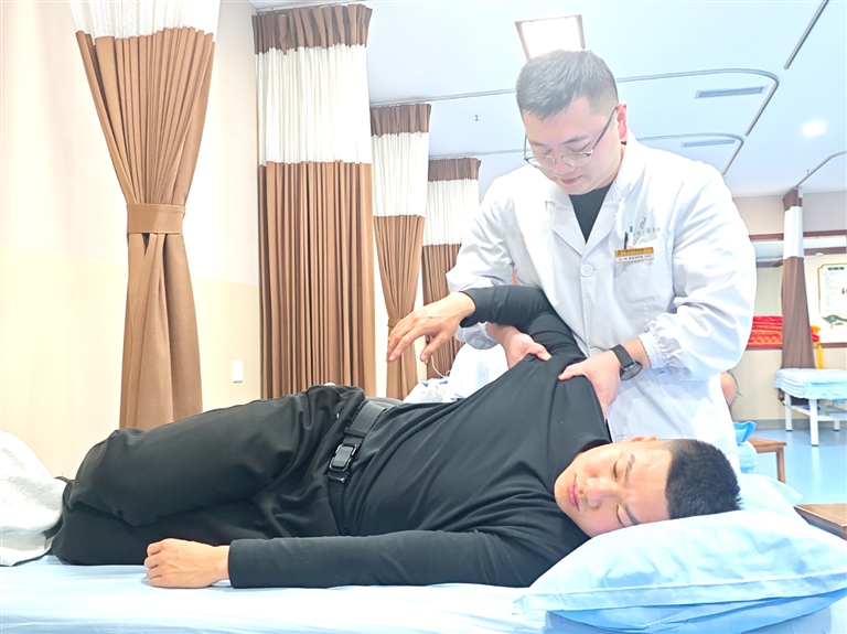 图为该院武当中医康复中心马一铭医师正在为肩周炎患者作经络推拿治疗。马更摄