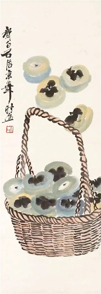 本文所附的齐白石《青柿图》中,柿子为一种青灰色的方形柿子,除了装满一篮柿子外,还有四个柿子自然摆放。他用水墨娴熟表现柿子的质感和形态,巧妙地把握好了色和水的度,使画面呈现的柿子新鲜嫩美,犹如带着露珠似的,尽情展示柿子的自然美,令人爱不释手。齐白石总用柿子这样最日常的题材进行创作,简单、自然、平实,饱含着对生活的质朴而强烈的爱,显示了艺术大师的风范。