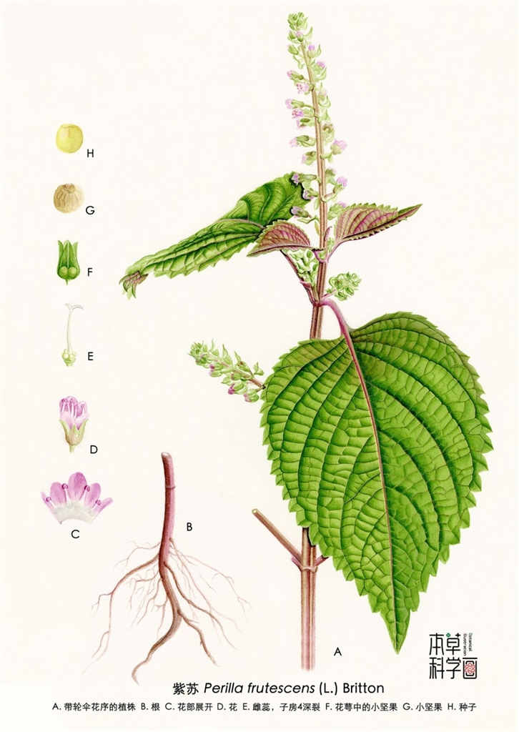 科学画精准捕捉了紫苏(Perillafrutescens)作为唇形科植物的典型特征。A带轮伞花序的植株显示,其茎秆呈独特的四棱形,披覆醒目的紫红色,这是其名中“紫”字的直接来源,也暗示了其性味辛温的药性特点。叶片宽卵形,边缘呈粗锯齿状,叶面褶皱起伏,这种结构不仅增加了光合作用面积,更利于挥发油的储存与释放。画面的精妙之处在于对其生殖结构的微观呈现。顶生的轮伞花序由无数小花层层叠聚,宛若一座精密的生态建筑。C花部展开特写清晰地展示了唇形科植物的典型特征:二强雄蕊、唇形花冠,这是其分类学身份的重要证据。E雌蕊,子房4深裂的细节,则揭示了其果实形成的特殊机制。待到花谢果熟,G小坚果便应运而生,H种子的形态特征更是体现了植物繁衍的智慧。这种从根系到种子的完整呈现,使观者能够全面理解紫苏的生命周期。