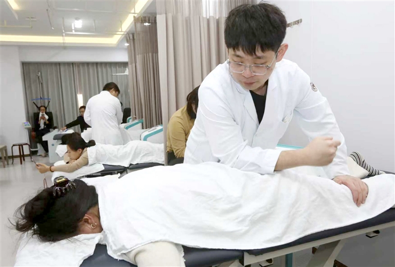 图为“上班族”正接受该院医生推拿治疗,缓解工作疲惫。本报记者于伟摄