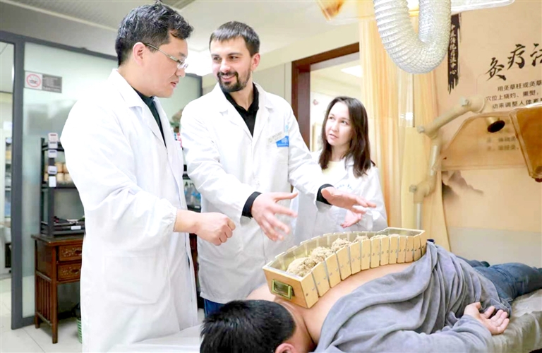 图为俄方专家在医院中医传统疗法中心学习督脉灸。钱星妤 谢筱筠摄影报道