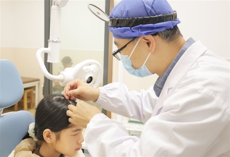 图为耳鼻咽喉科中医师为患儿进行治疗。 周丽平摄