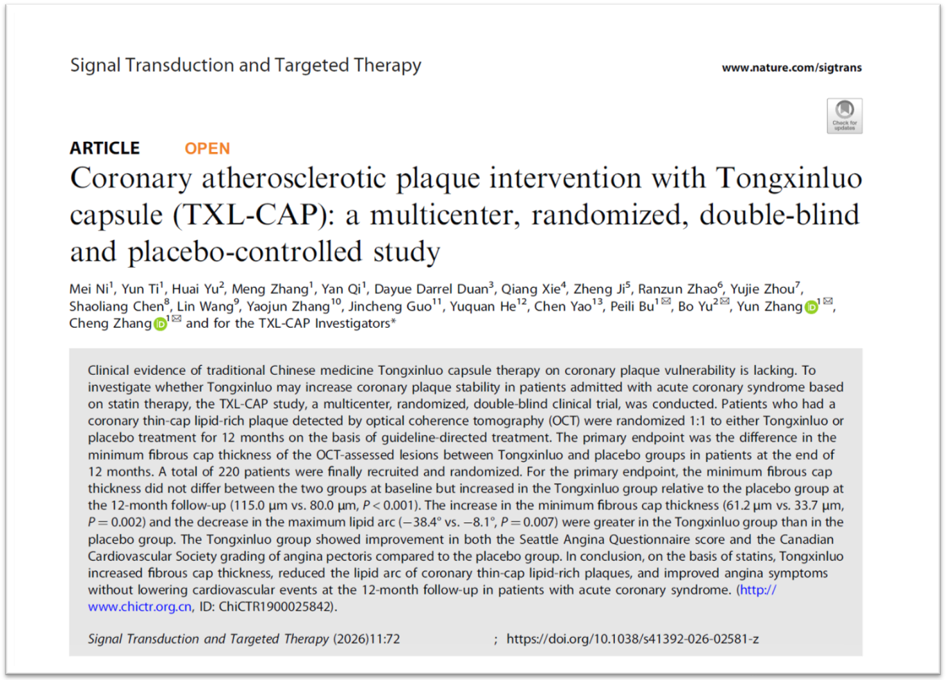2月24日,“通心络胶囊干预急性冠脉综合征冠状动脉粥样硬化斑块的随机、双盲、安慰剂平行对照、多中心临床研究(TXL-CAP多中心研究)”论文在施普林格・自然集团(Springer Nature)主管的国际权威学术期刊《信号转导与靶向治疗》(Signal Transduction and Targeted Therapy,简称STTT,影响因子52.7)在线发表。结果显示,在他汀等现代标准治疗基础上联合使用通心络,可显著增加急性冠状动脉综合征患者冠状动脉易损斑块纤维帽厚度,减小斑块脂质弧度,并改善心绞痛症状,为临床稳定冠状动脉斑块提供了有效的治疗手段。