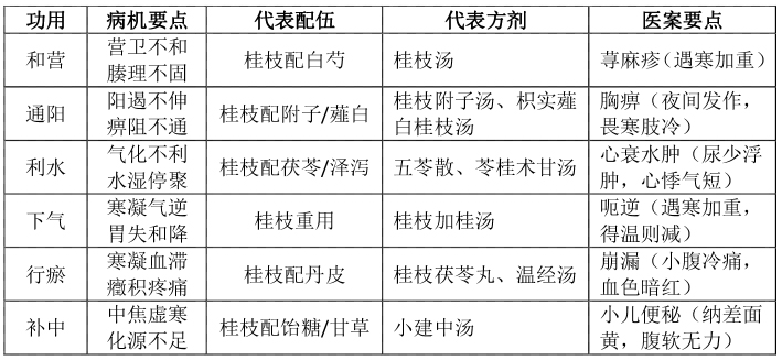 桂枝“六用”临床应用归纳表