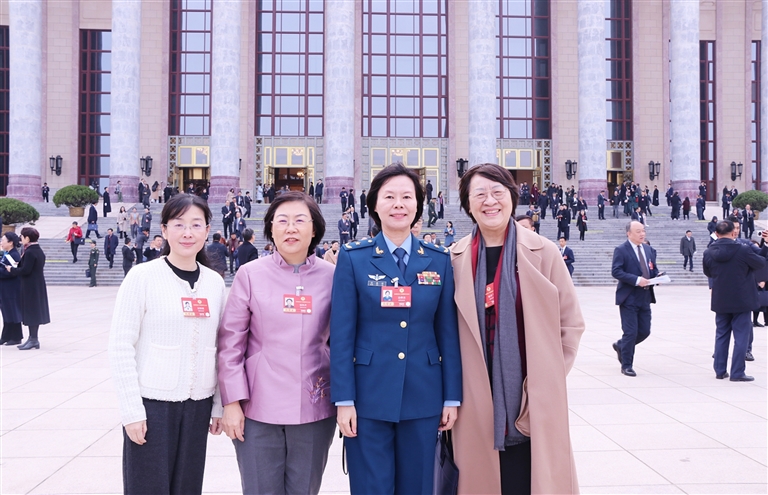 在“三八”国际劳动妇女节到来之际,参加全国政协十四届四次会议第二次全体会议的医卫界部分女委员在人民大会堂前合影留念。自左至右依次是封颖璐、徐凤芹、边惠洁、杨宇飞。