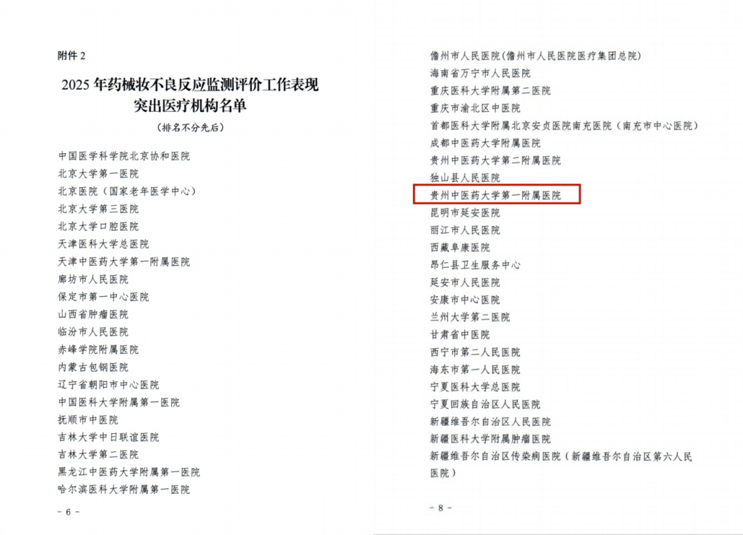近日,国家药品监督管理局药品评价中心、国家药品不良反应监测中心联合发布《关于表扬2025年全国药械妆不良反应监测评价工作表现突出单位的通报》(监测与评价办〔2026〕2号),贵州中医药大学第一附属医院上榜,获评2025年药械妆不良反应监测评价工作表现突出医疗机构。