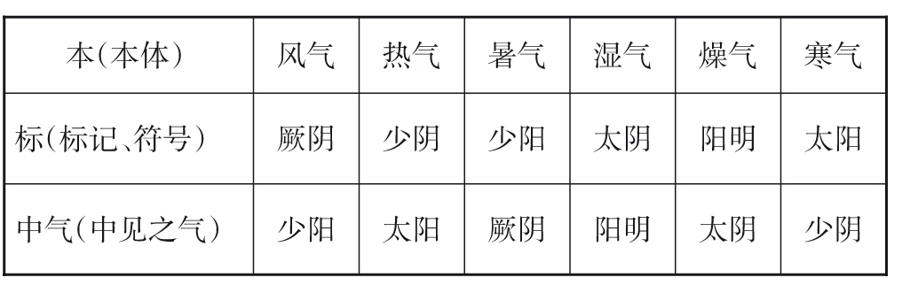 从表中可以清楚地看出,“三阴三阳”六气的“标”和“中气”之间,一定是“两两互为中气”的,如风气之“标”为“厥阴”,其“中气”一定是“少阳”;而暑气之“标”为“少阳”,其“中气”一定是“厥阴”。湿气、燥气的“标”和“中气”,寒气、热气的“标”和“中气”也一定是“两两互为中气”的。