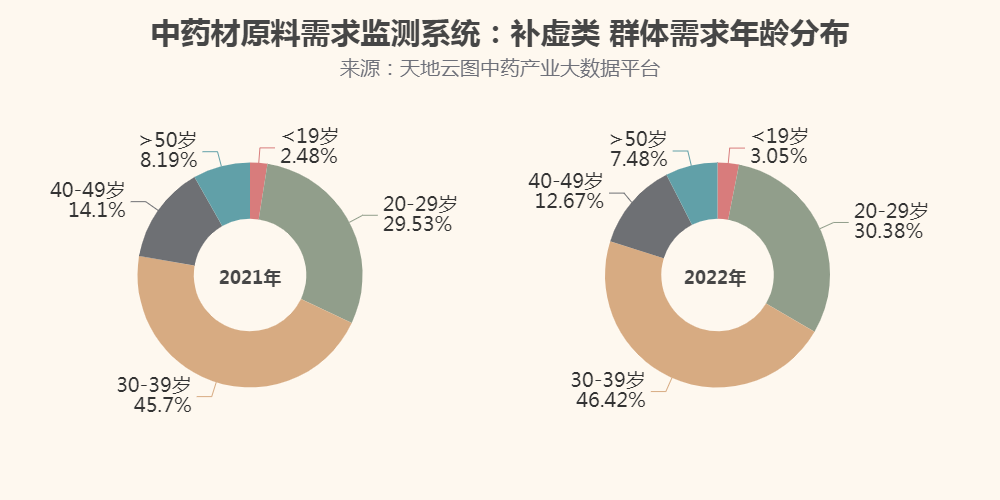 从群体监测看:2022年,中青年对补虚类中药原料的需求占比有所提高。2022年,补虚类消费群体依旧以中青年为主,其中19岁以下群体占比达到3.05%,较2021年增长0.57%;20~29岁群体占比达30.38%,较2021年增长0.85%;30~39岁群体占比达46.42%,较2021年增长0.72%。