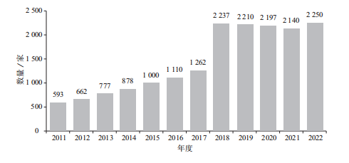 2011~2021年,中药饮片企业数量总体呈现增长趋势,自2011年的593家增长至2019年的2210家。截至2022年,已注册的中药饮片企业有2250家。