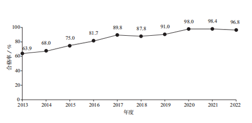 2013~2022年中药材及饮片国家药品抽检合格率。