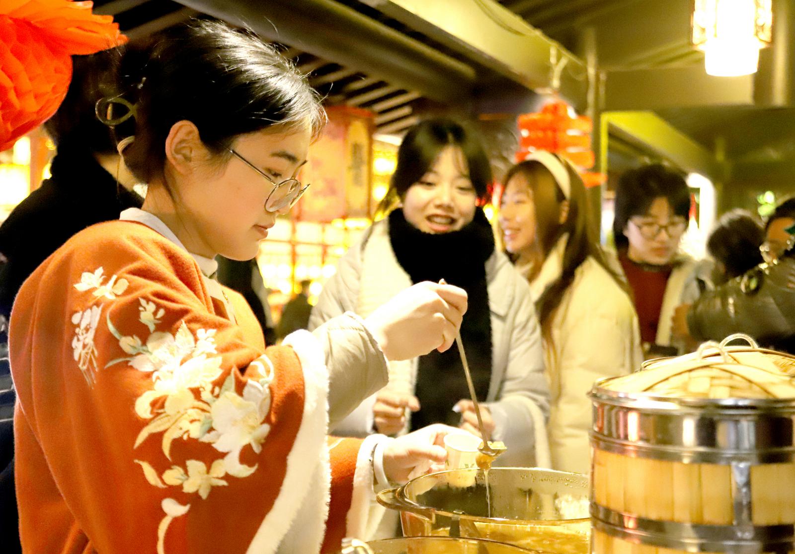 在各地举办的庙会、灯会上,中医药体验项目精彩纷呈,融入龙年春节氛围。在四川自贡举办的第30届自贡国际恐龙灯会上,流光溢彩中有一座中医药文化体验馆。馆外,药师、药童人偶是孩子们争相拍照“打卡”的必选地,酸梅盐饮、养生银耳汤、姜枣茶等药食同源产品更是牢牢抓住了游客们的味蕾。随着悠扬的古风乐律响起,游客们在两名身着练功服的女子的带领下体验八段锦,一招一式中提升正气。