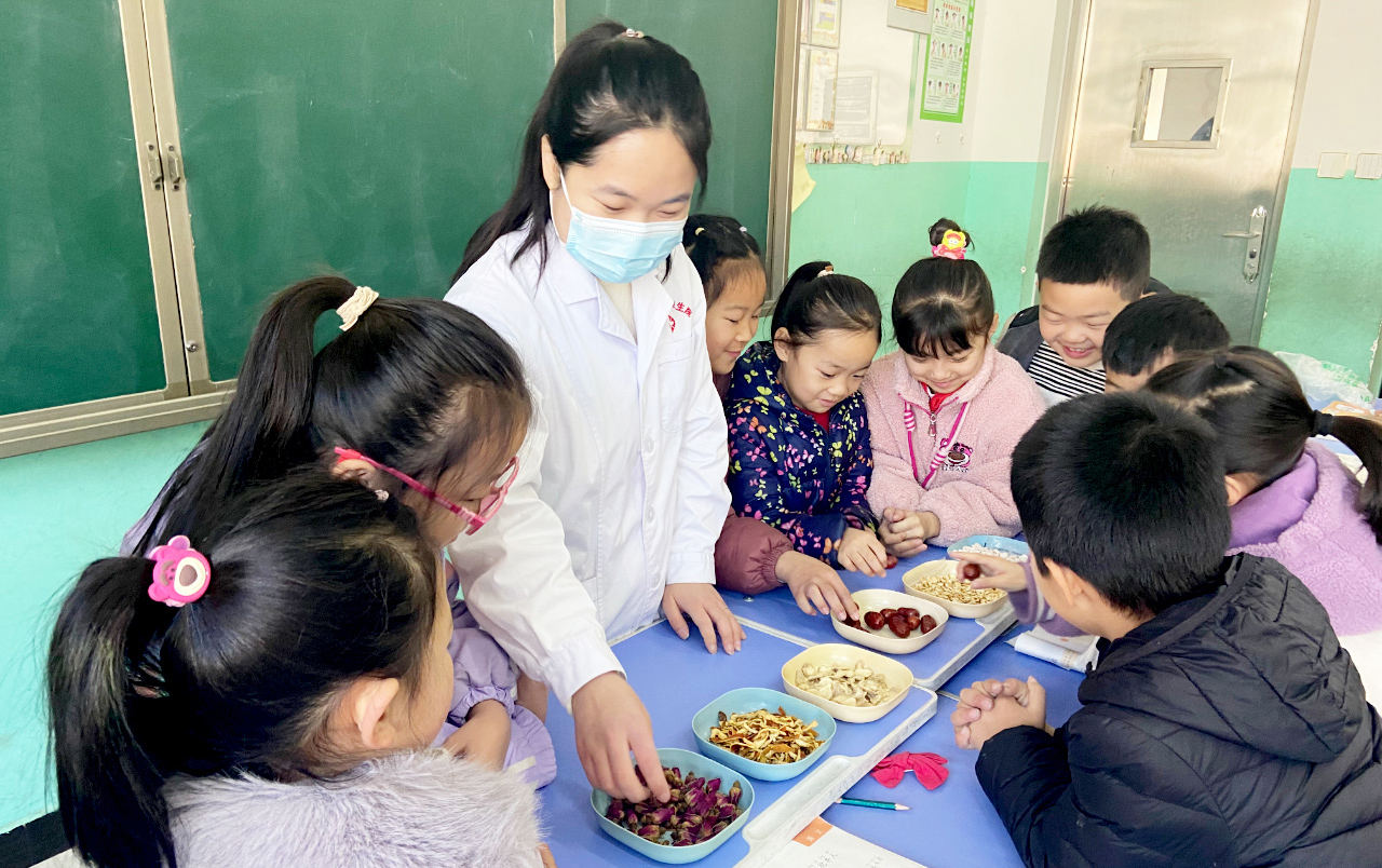 为进一步弘扬中医药文化,让学生学习了解中医药知识,河北清河县王官庄中心卫生院医务人员赴清河县漓江小学开展中医药文化进校园活动。图为卫生院中医科医师带领学生辨识中草药。陈靖寿摄