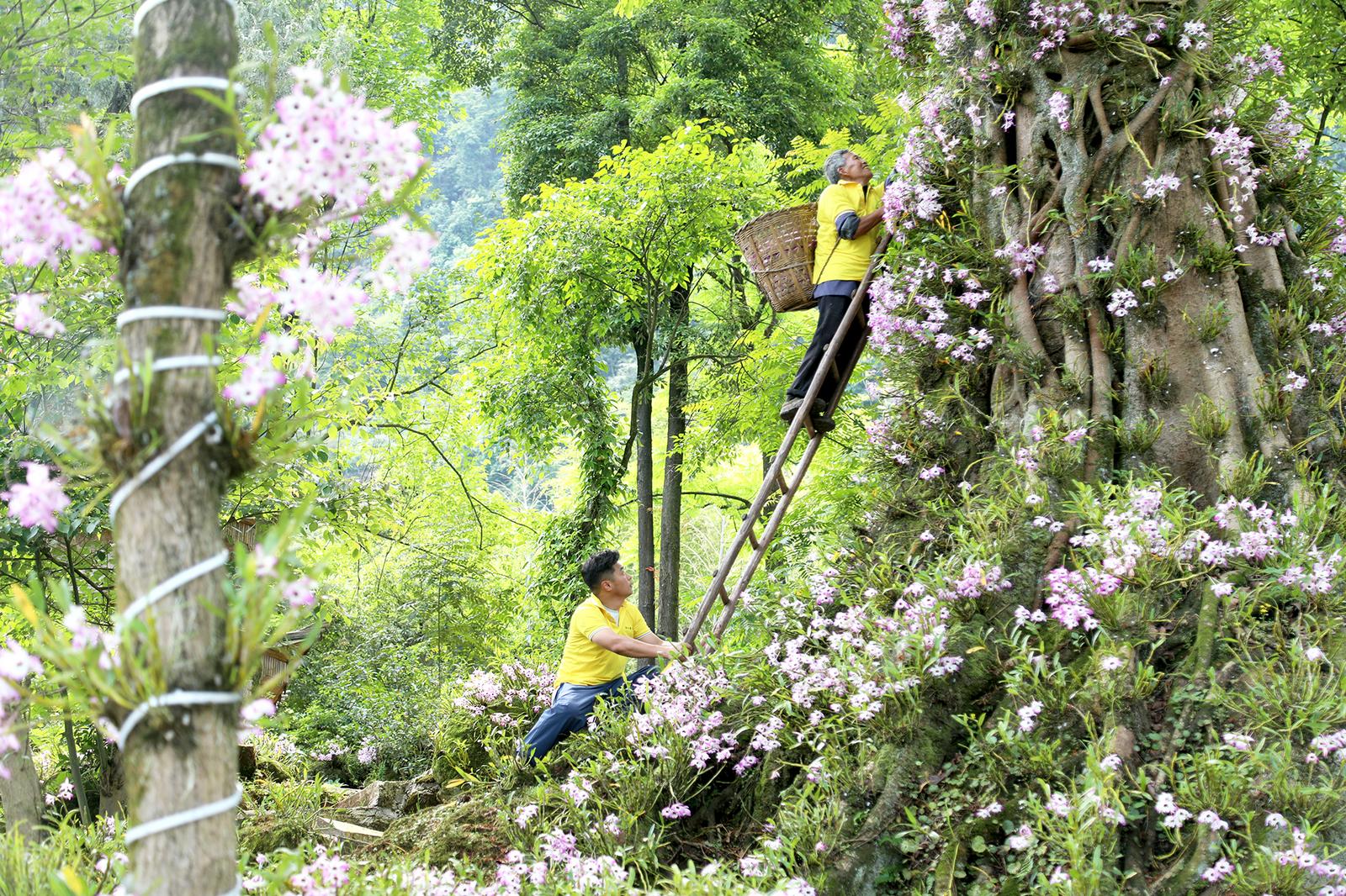 四川省泸州市合江县福宝镇福森种养专业合作社工作人员在采摘石斛花。赵运懿摄