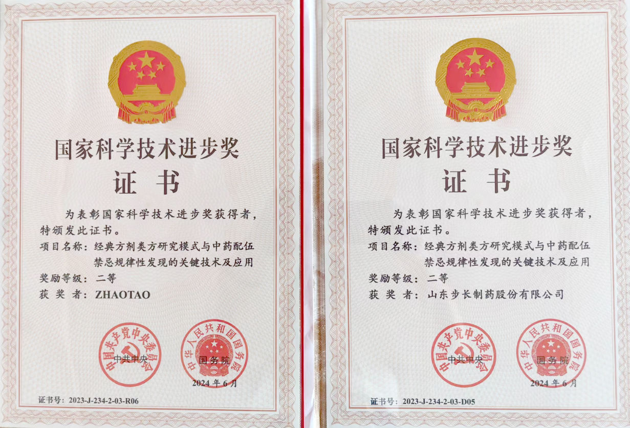 6月24日,国家科学技术奖励大会在北京召开。山东步长制药股份有限公司及董事长赵涛参与完成的“经典方剂类方研究模式与中药配伍禁忌规律性发现的关键技术及应用”项目获得2023年度国家科学技术进步奖二等奖。