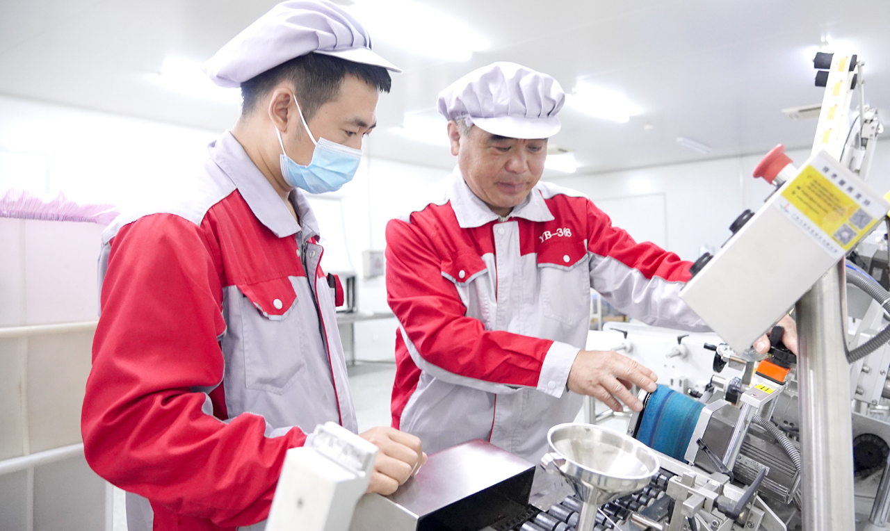 保定中药技能大师、河北省劳模刘文卿(右一)在制药车间做技术指导。受访者供图
