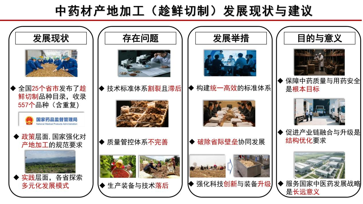 政策层面,从2016年发布的《中医药发展战略规划纲要(2016—2030年)》到2025年发布的《关于提升中药质量促进中医药产业高质量发展的意见》,政府持续强化对中药材产地加工的规范要求。《国家药监局综合司关于中药饮片生产企业采购产地加工(趁鲜切制)中药材有关问题的复函》,明确了饮片企业对采购鲜切药材的质量主体责任、加工参照GMP、建立追溯体系等核心原则。