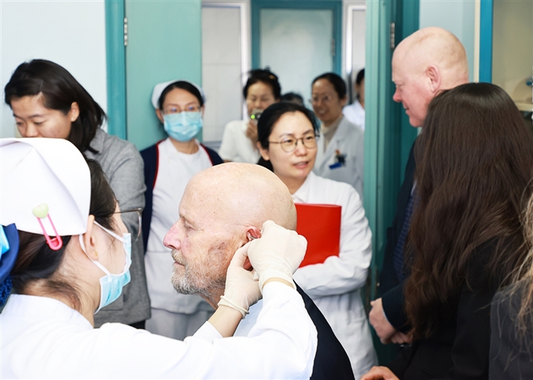 外国学者正在体验耳穴压豆。