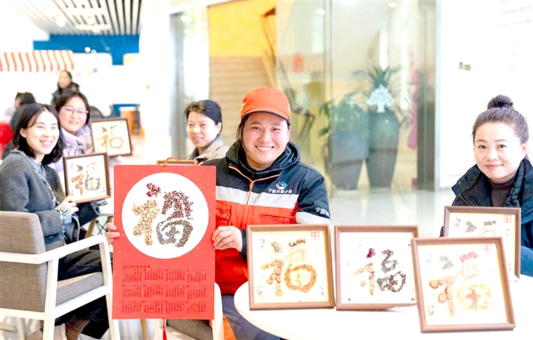 活动现场,在宁波国医堂专业人员指导下,大家手持玫瑰花、薰衣草、决明子等药材,精心构思、细致拼贴。普通的中药材在大家的巧手中,变成了一幅幅寓意吉祥的贴画,饱满的“福”字、雅致的梅花,每一幅作品都饱含着对新春的美好祝福。