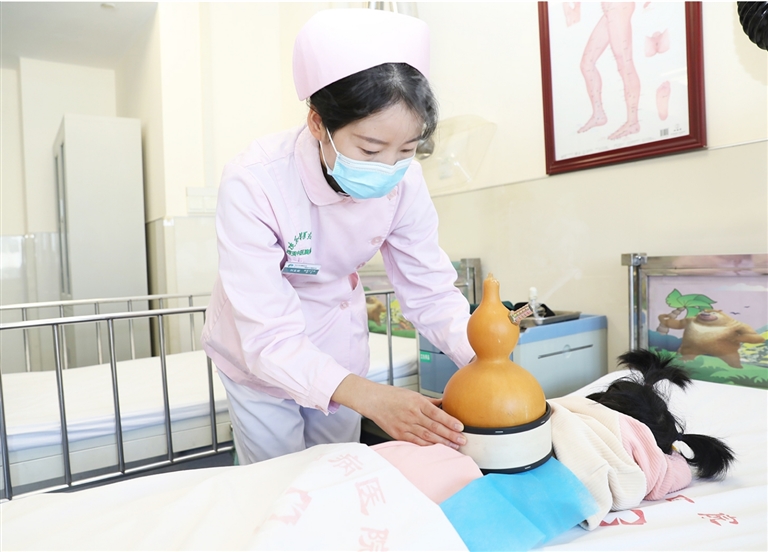 图为西安中医脑病医院医护人员为住院孤独症儿童进行葫芦灸治疗。