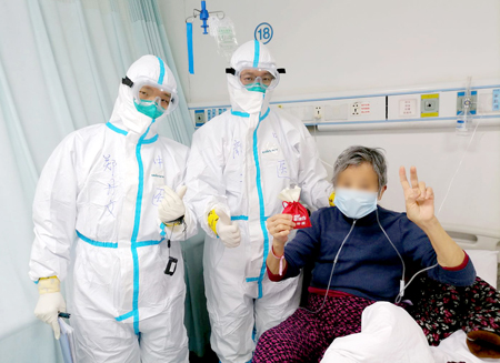 之前弥漫在病人中间的恐惧、绝望、焦虑等情绪慢慢消失了,病人放弃治疗甚至自杀等极端行为更是没再出现,取而代之的是每天查房时病人亲切地打招呼:“哎呀,中医来了!”“医生,我今天好多了!”“颜主任,你们明天还来吧?”“是广东省医疗队给了我第二次生命啊!”……病人远远地就能认出全副武装的我们,病人之间也从开始的沉默寡言,变成了相互攀谈、鼓励甚至开起玩笑来。原来焦虑的病人心境明显平和了,有了满满的康复出院的信心,原来失眠的病人也能从每晚只睡一两个小时到整晚安眠。
