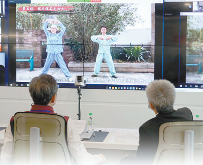 4月22日,在马来西亚吉隆坡,中国赴马抗疫医疗专家组与马各地中医药界人士视频连线。图为现场播放八段锦练习视频。人民视觉