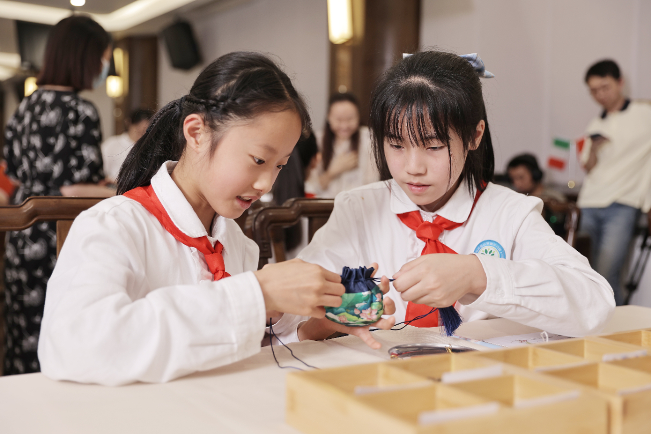 成都市实验小学青华分校学生们正在制作香囊