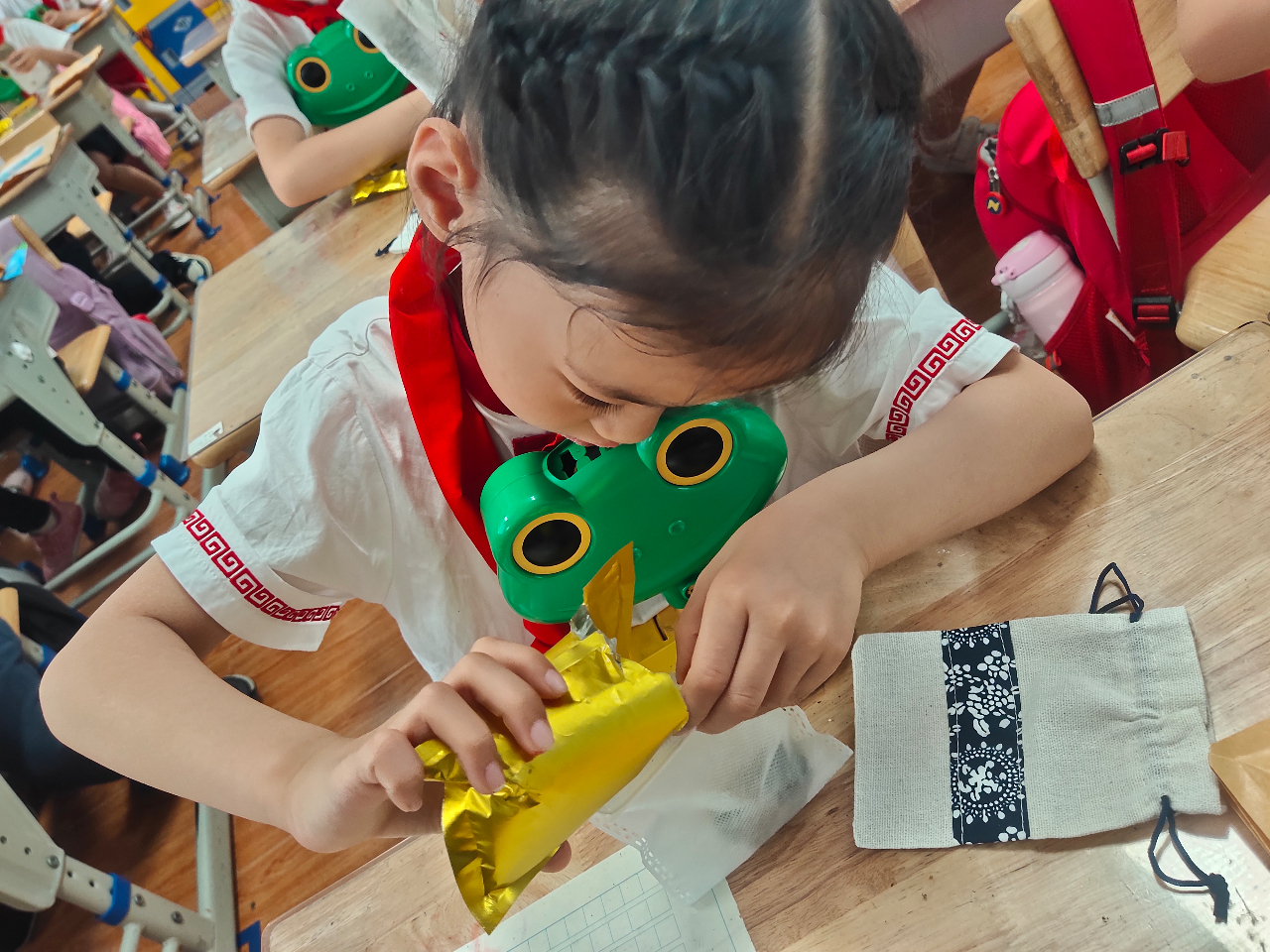 随后,同学们进行了一系列动手实践活动,护眼穴位按摩,沉浸式体验了“中药香囊”和“艾草护眼罩”的制作。在详细讲解了香囊和眼罩的制作方法后,同学们就热情高涨、兴致盎然地开始制作自己的香包和眼罩了。同学们小心翼翼地取出艾草,一点一点装入布袋。中药香在教室里弥漫开来,同学们闻着中草药的气息,体验着指尖上的浓情端午。当小小香囊做好,特有的芬芳,让同学们感觉新鲜又快乐,充满了成就感!小小眼罩完成后,同学们就迫不及待地戴上,有的孩子还表示:要送给辛苦工作的爸爸妈妈们!