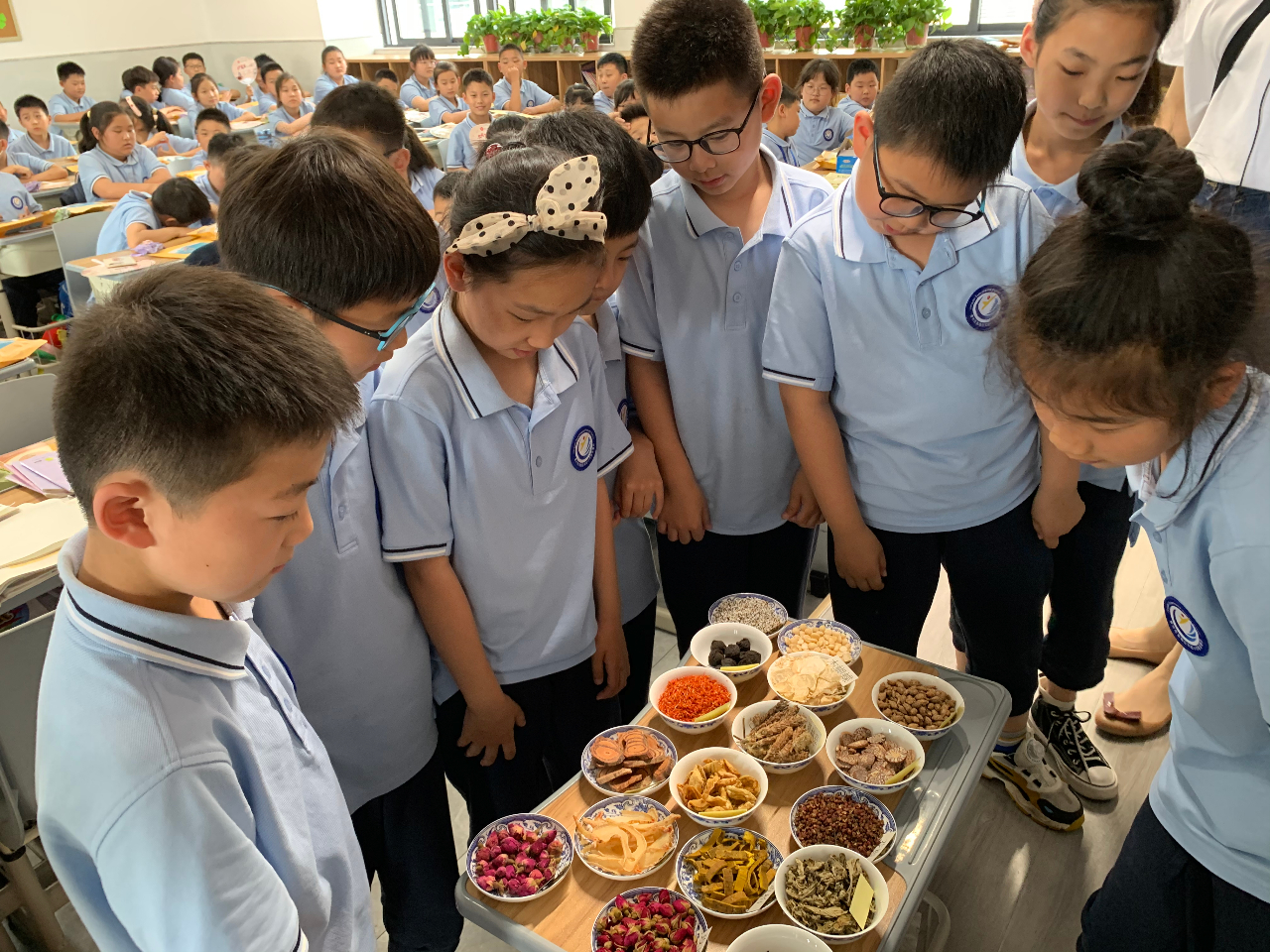 学生们近距离认识、感触、辨识中草药
