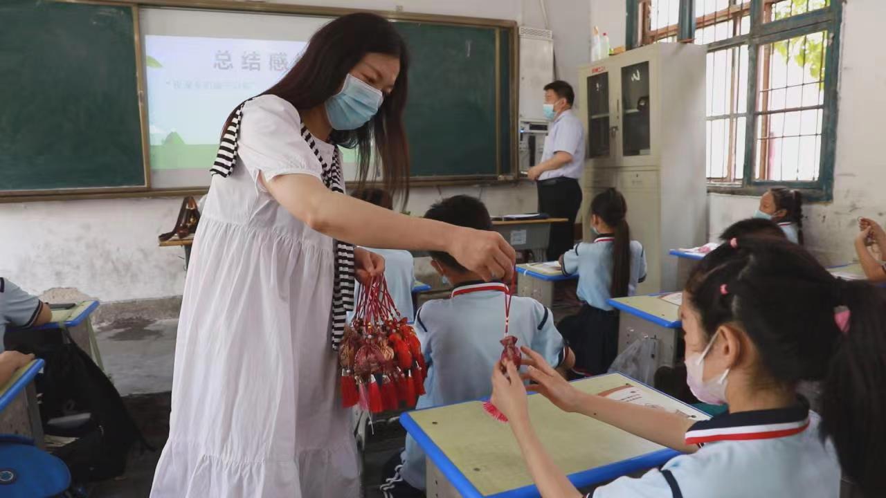 河南省中医药文化科普巡讲专家、鹿邑县中医院副院长、副主任中医师朱超采用课件和互动问答的方式先后为学生们讲解了“端午节的起源、端午为什么要插艾草、以及艾草的功效”等相关知识,并为学生发放香囊,教同学们认识香囊中的9种药材,传播中医药文化知识。