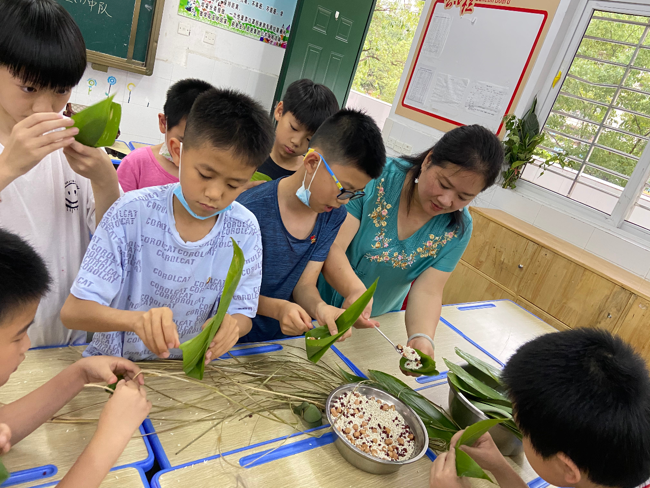 如制作艾草花束,既应了时节又让孩子们真正了解传统工艺;制作香囊,孩子们小心翼翼地将薄荷、艾蒿、茉莉花填进精美的香囊,缝制、封口,一个“五日节”香囊就做成了;教室里包粽子,做蛋兜,孩子们忙得不亦乐乎。