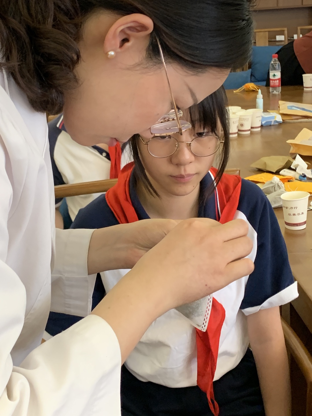 “你知道为什么要认真做眼保健操么?”、“你知道哪些保护眼睛的方法?”结合全国爱眼日的主题,德育处副主任郭宇晨带领同学们在现场体验了护眼穴位的按压法,传授了爱眼护眼的中医小妙招。在现场,根据老师的指导,同学们自己动手制作中医药护眼眼罩,体验中医护眼的神奇功效,感受中医药的博大精深。