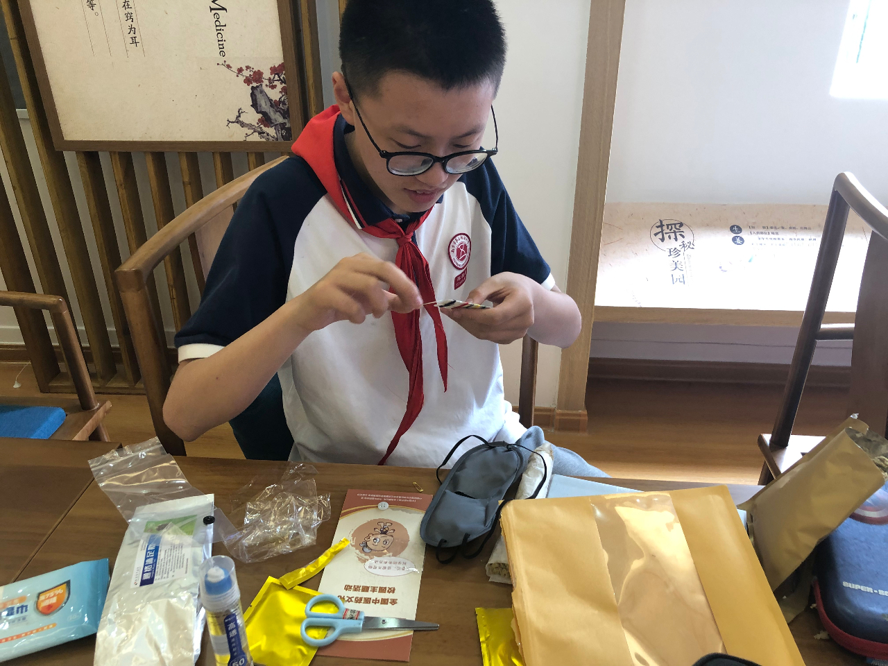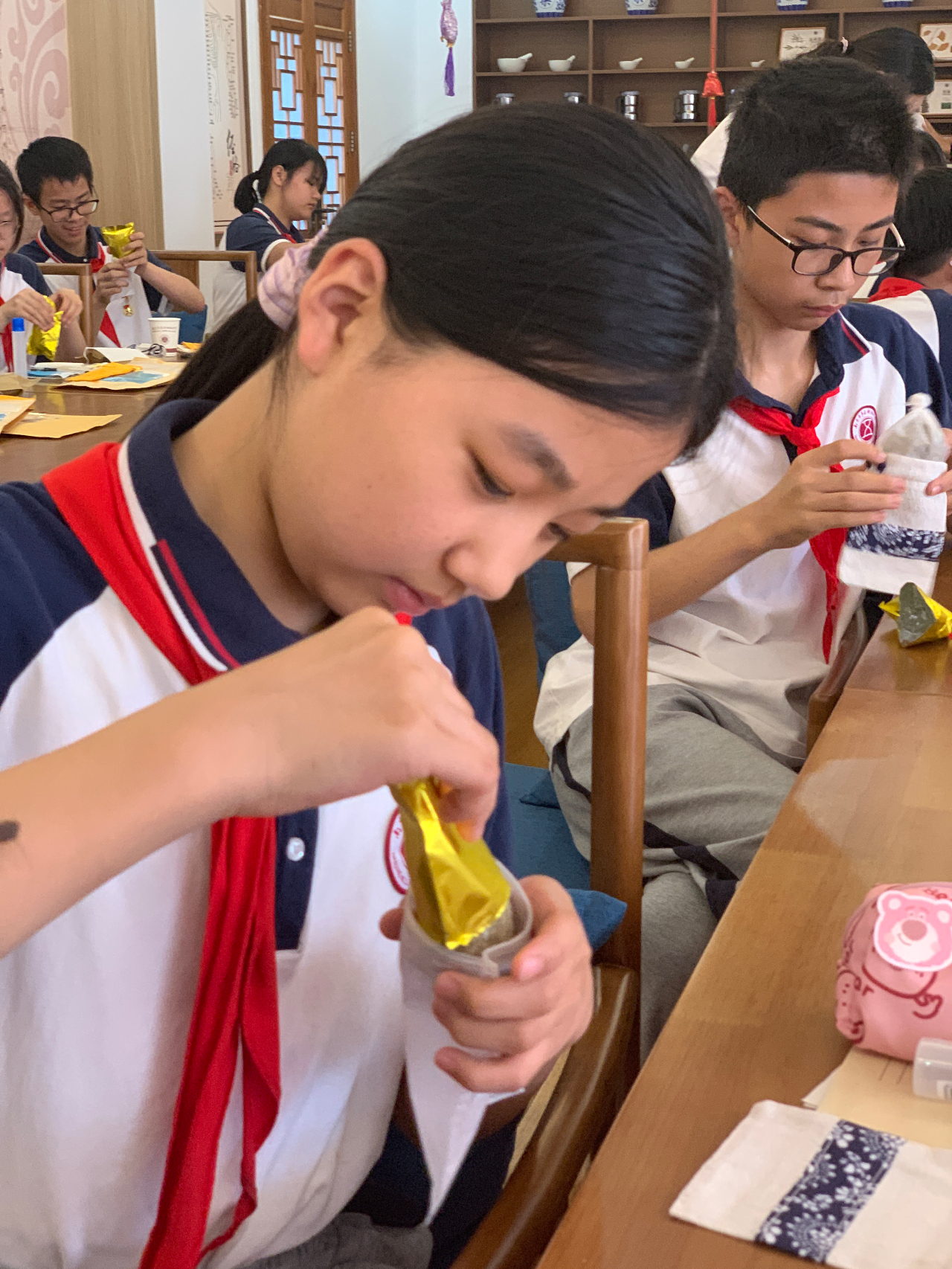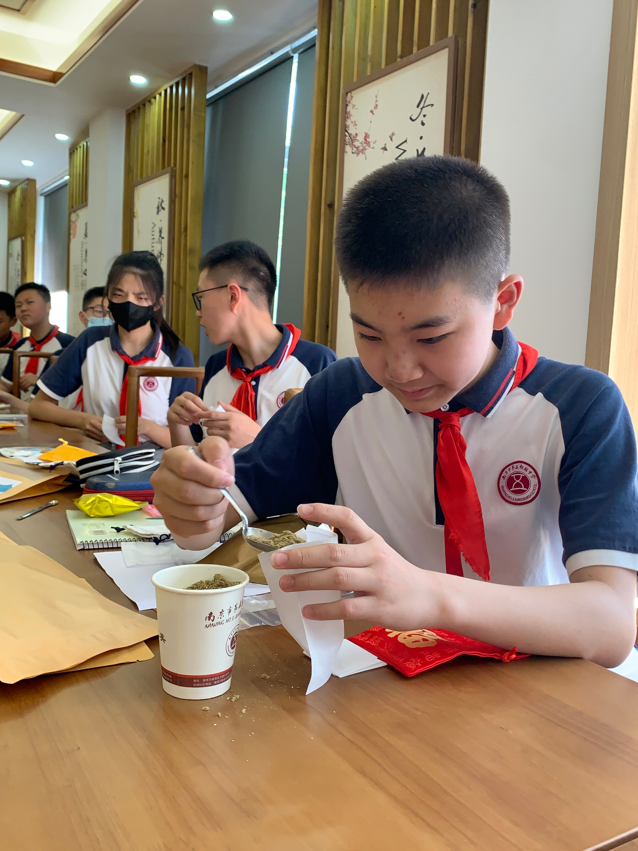 在互动环节——制作端午香囊的活动中,来自江苏省中医院制剂部的药师张梦晨和陈慧慧带领同学们了解了端午香囊的作用,认识了制作香囊的“苍术”、“白芷”、“艾叶”、“藿香”等七味中药材,并为同学们准备了制作香囊的药粉。在活动现场,同学们纷纷动手,将药粉装入袋中,制作端午香囊。看着自己亲手制作的香囊,心里别提有多开心了!