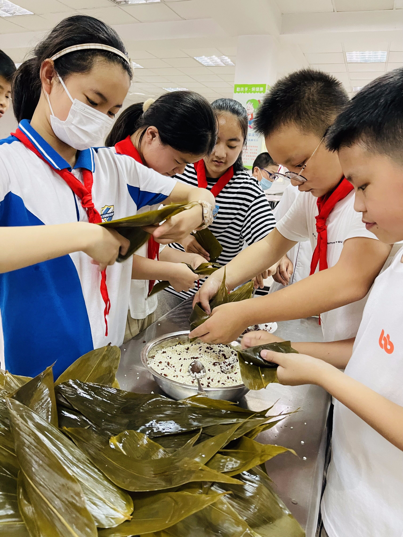 说起端午节,自然少不了粽子!其实,粽子是一种药膳,可解烦躁,清热利尿。望小娃们在了解了必要的中医药知识后就撸起袖子,包起粽子,学校志愿者团队“小黄帽”冒着烈日,将一份份热气腾腾的粽子送到了学校师生的手中,分享了劳动的快乐与甜蜜!