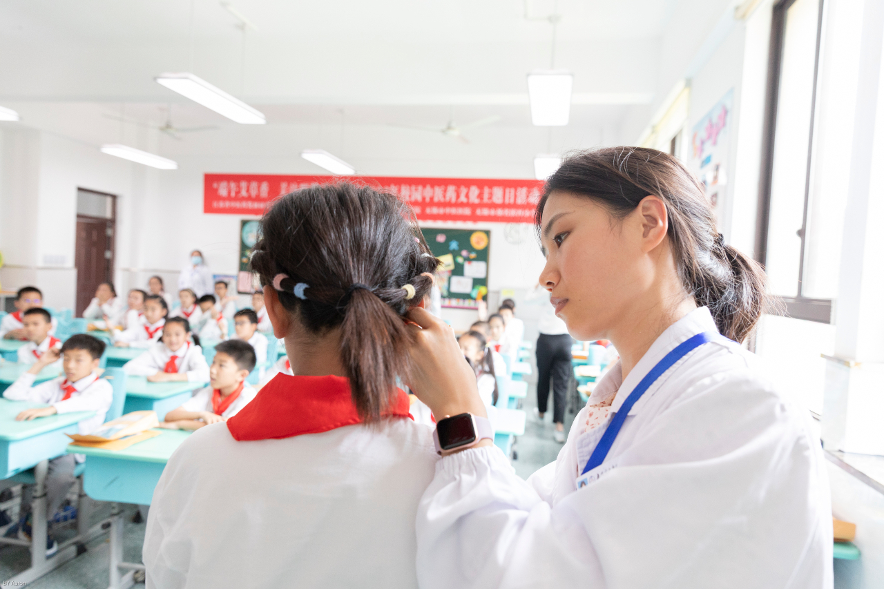 随后,眼科医生结合爱眼日为孩子们讲解眼睛的相关知识,普及青少年保护视力健康常识,传授中医眼保健的相关方法。活动中,同学们积极参与,不仅对中药及眼科知识有了很深入的了解,还体验了中医耳穴压丸护眼法。