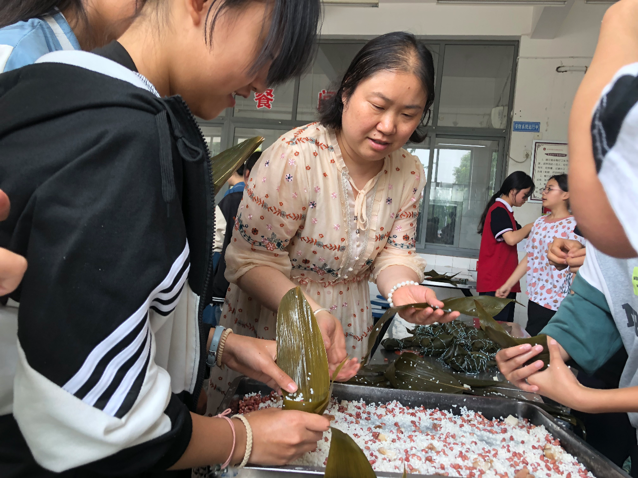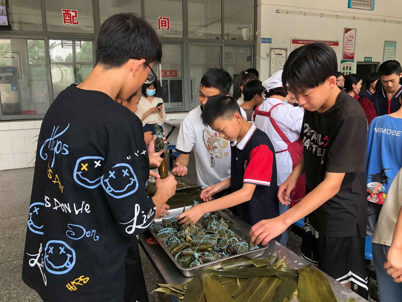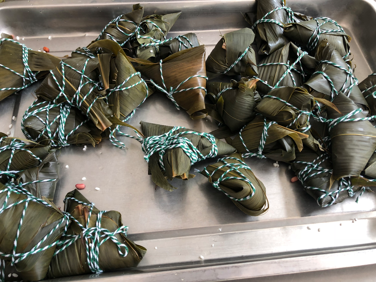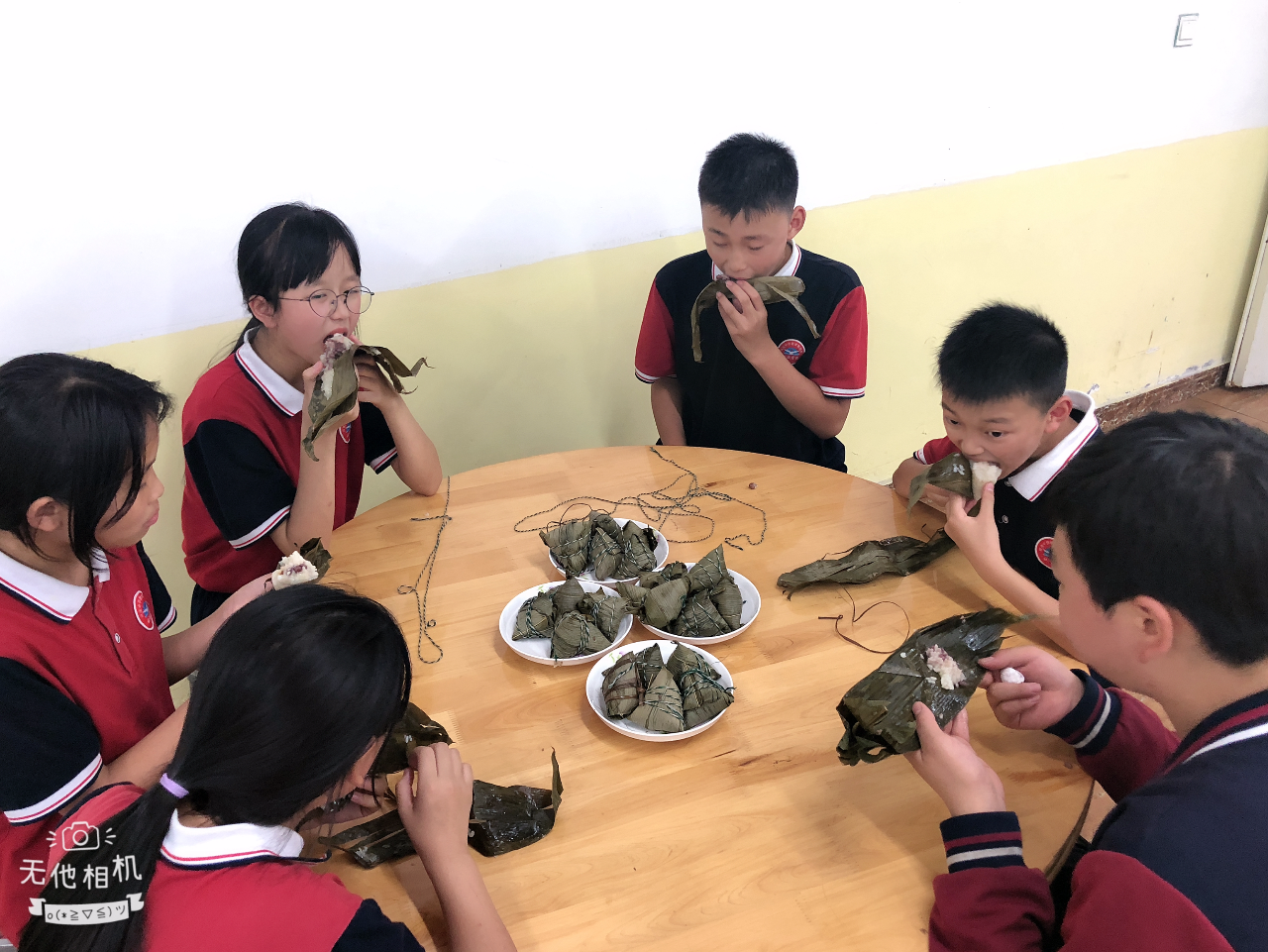 “一折叶,二盛料,三压实,四掐角,五包裹,六扎绳”,伴随着口号声声,同学们学会了拿捏粽叶的手法和捆绑棉绳的方法,不一会儿,一个个有模有样,有咸有甜的粽子陆陆续续诞生了。从无到有,从匆忙到从容,同学们包得越来越得心应手,脸上也不由得露出藏不住的笑容和自豪。