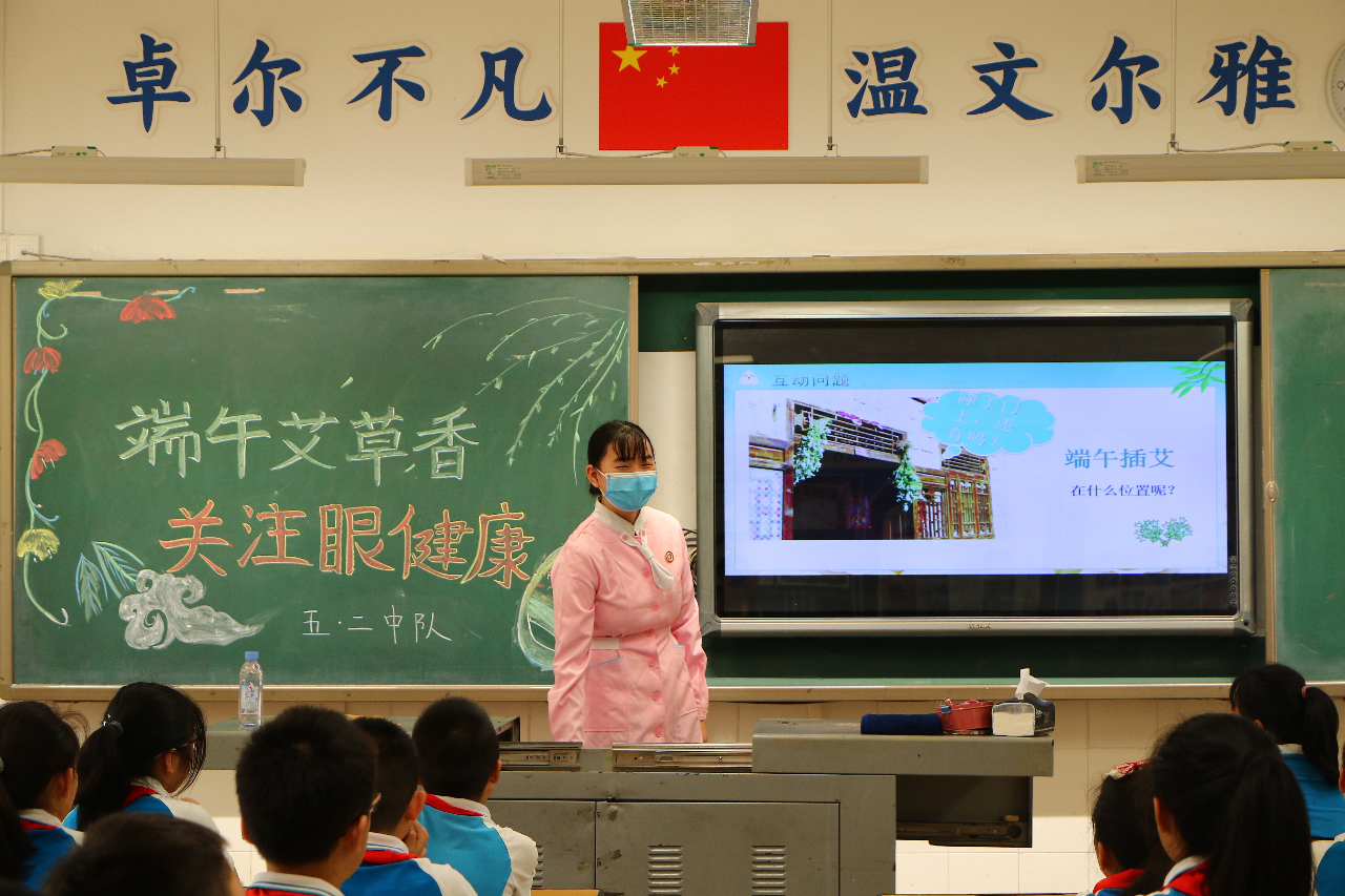 王医生从端午习俗引入,探索端午节里的中医智慧,带领同学们认识艾草的神奇功效。同时,王老师还带来了一些常见中草药,同学们纷纷积极传看。中医护眼有妙招,王医生向大家讲解中医整体观、五行与五官、明目中药等科普知识,并示范按摩丝竹空穴、攒竹等护眼穴位,希望同学们都能爱护自己的眼睛,拥有光明的未来。