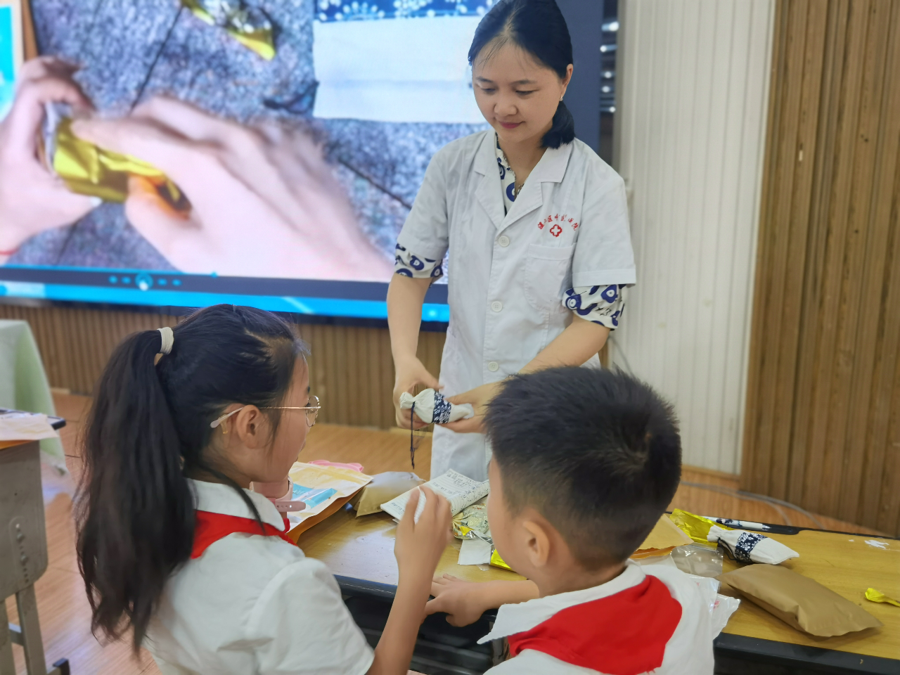表演结束后,温江区中医院的王茂珩医生为40位四五年级的优秀少先队员带来了丰富有趣的“端午艾草香 关注眼健康”中医药文化主题课。同时,20位来自成都中医药大学的志愿者们分别前往各分会场,为四五年级的1000余名卓雅娃们带去精彩的中医文化课程。