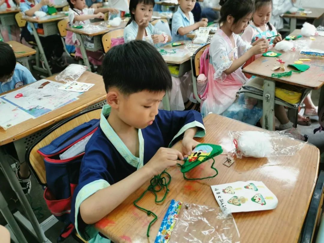 香囊又叫香袋、香包、荷包等,汉代《礼记》有云:“男女未冠笄者……衿缨皆陪容臭”。容臭即香囊,端午节佩香囊,传说有避邪驱瘟之意。香囊内有朱砂、雄黄、香药,外包以棉布,清香四溢,作各种不同形状,形形色色,玲珑可爱。孩子们齐动手,再缝制一个香囊粽吧!