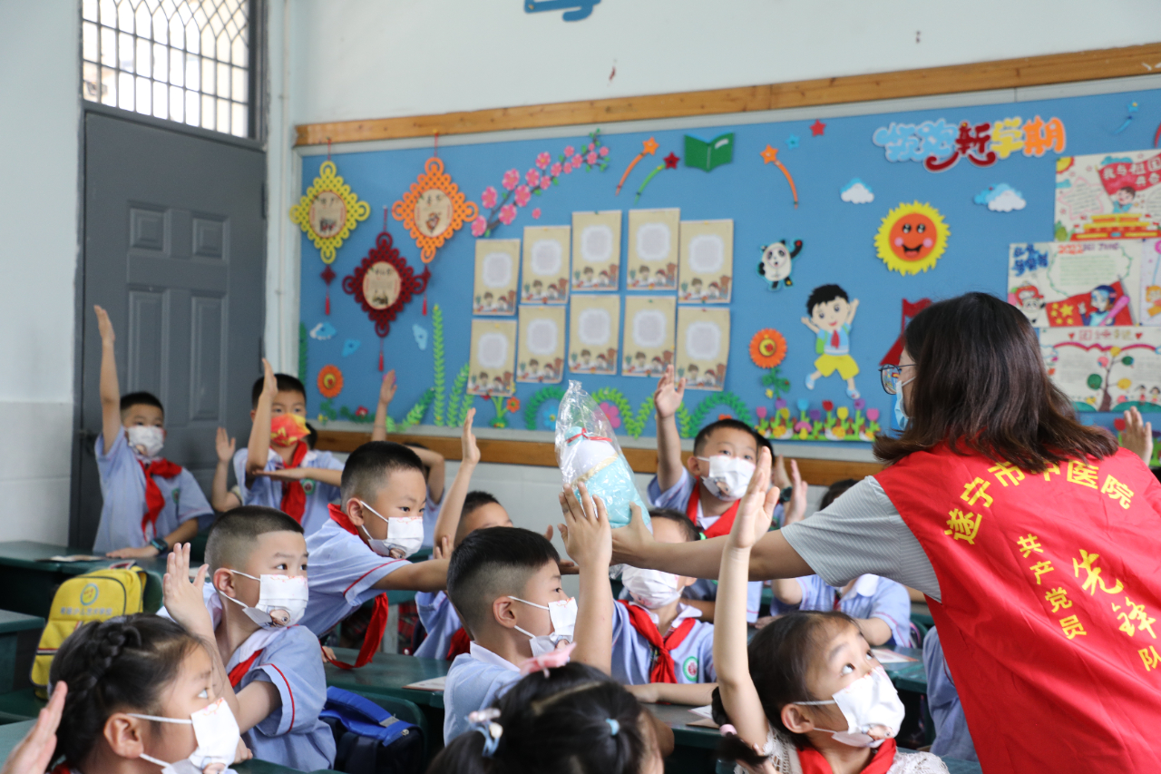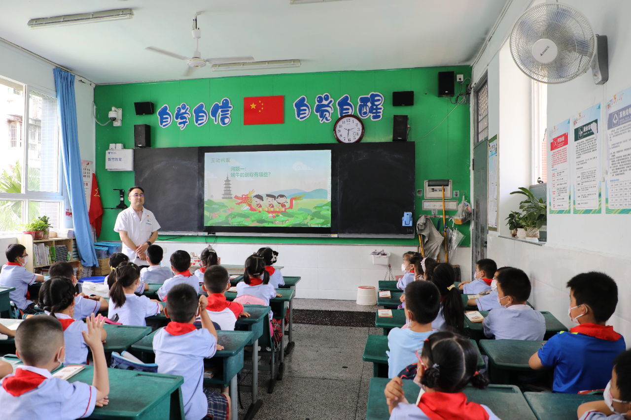 “端午节是怎么来的?端午为什么要插艾草?艾草插在什么位置?”遂宁市中医院和平路院区眼科副主任中医师、硕士生导师周季家通过多媒体,先后为同学们讲解了这些传统民俗文化,并进行了趣味问答互动,为答对的同学送上可爱的“莲宝”。